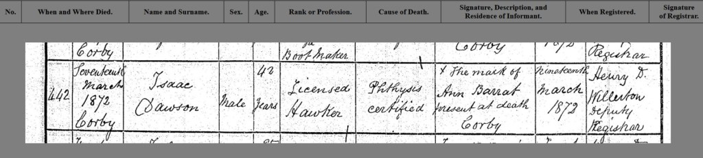 Isaac Dawson died on 17 March 1872 aged 42 years of phthisis (tuberculosis). He had been a licensed hawker. His death was announced in the Grantham Journal: Dawson.—At Corby, the 17th inst., Isaac Dawson carrier, aged 42 years.