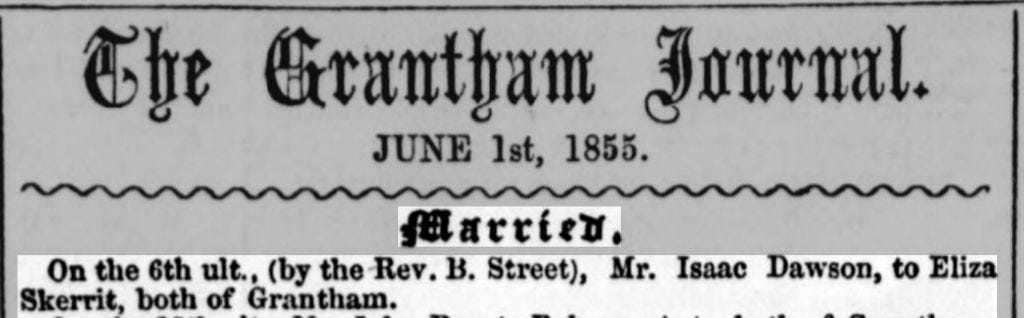 On 6 May 1855 Isaac Dawson, son of Thomas Dawson, married Eliza Skerritt, daughter of Robert Skerritt, in St Wulfram’s church, Grantham, Lincolnshire. Isaac, Thomas, and Robert were recorded as labourers. Isaac signed his name; Eliza made her mark. The witnesses were Samuel Brown and Ann Skeritt.